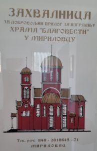 Za financijski prinos u izgradnju Hrama Blagovesti u selu Mirilovac.