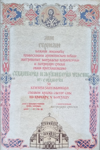 Zahvalnica od srpskog patrijarha za ktitora – zadužbinara Spomen-hrama Svetog Save na Vračaru u Beogradu, 13/6/1988.